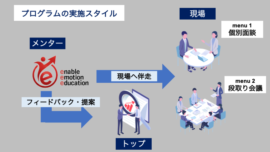 実際に現場と接触し、現場と伴走できる「社外メンタープログラム」に取り組んでください。