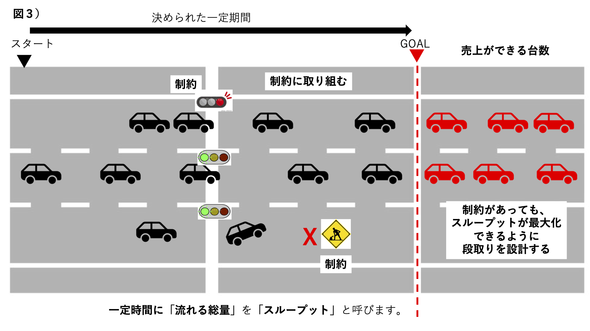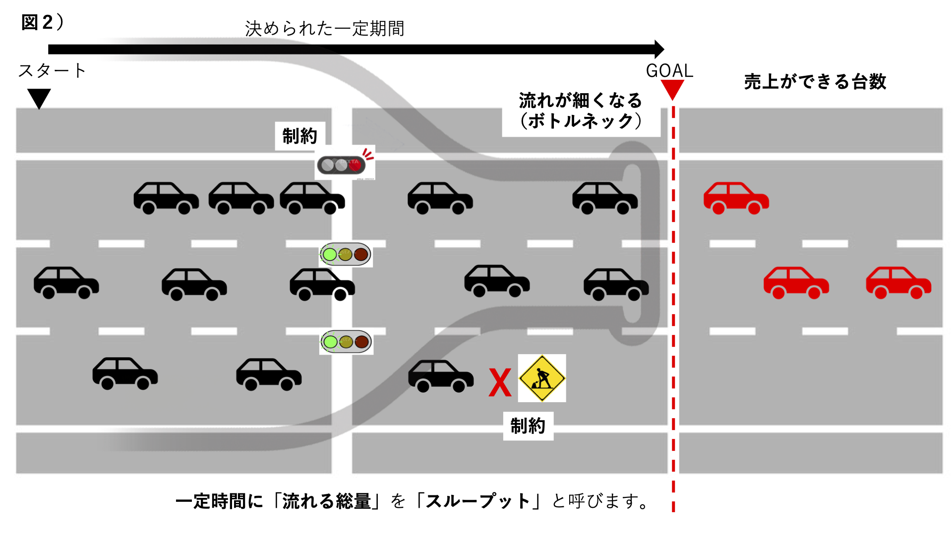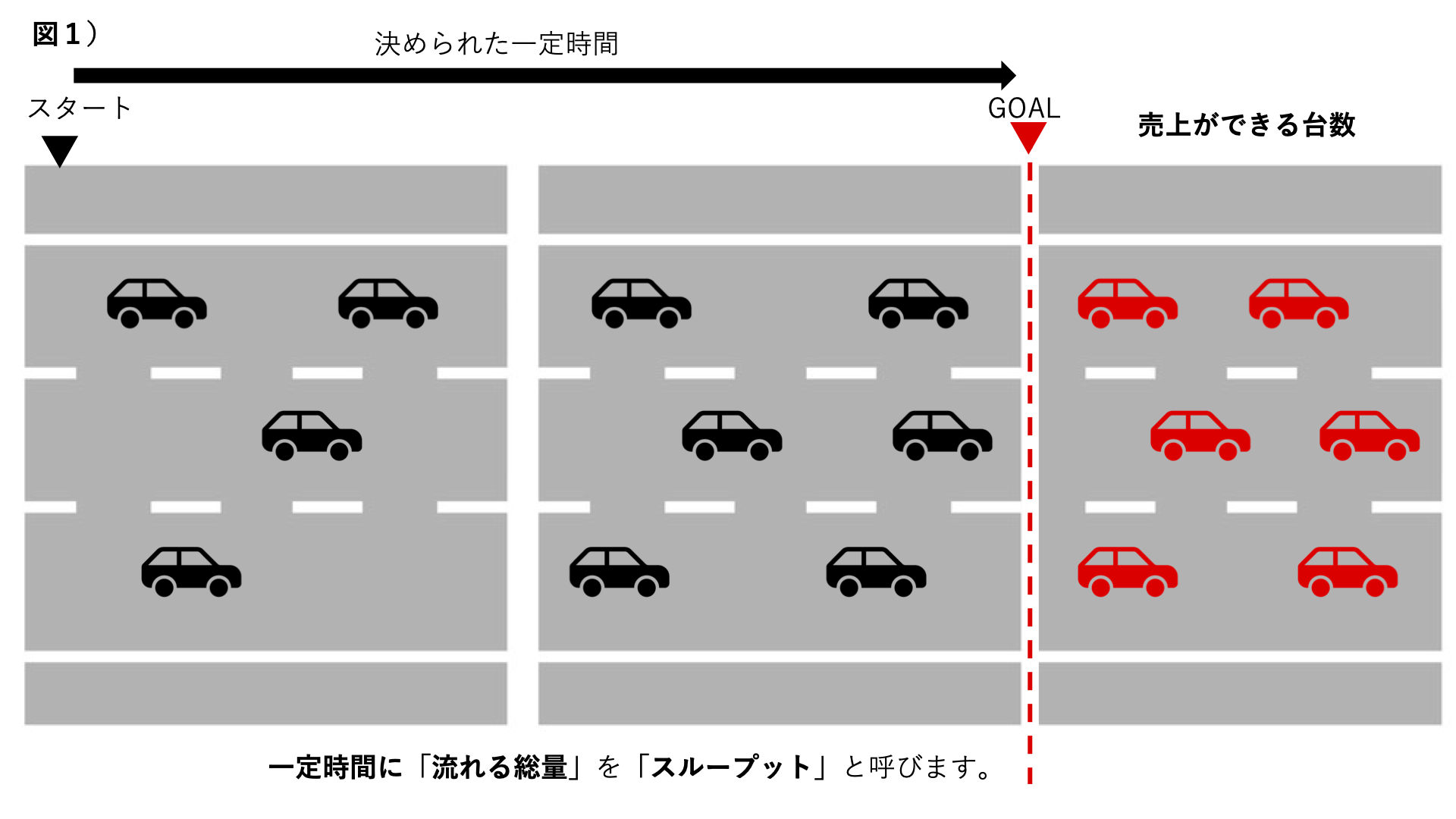 売上(スループット)の考え方を、交通の流れに例えて説明します。(図1)